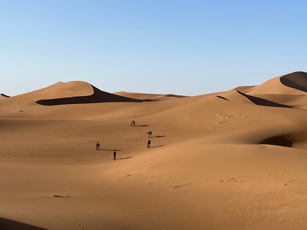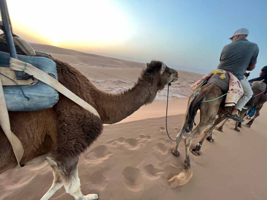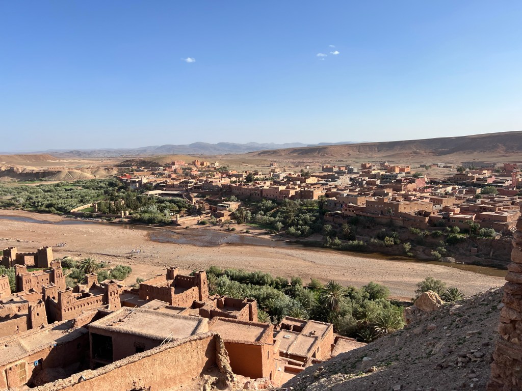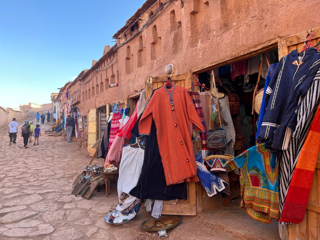At the edge of the Sahara outside a town call Ouarzazate is the the Hollywood of Africa. A sweeping walled complex where films like The Gladiator and Game of Thrones filmed their desert scenes. It seems such an oddity and unwelcome reminder of that which you are here to escape. That being said it brings tourists to this corner of Morocco that may never have come and with it money so welcomed by the local economy. The Village Ait Ben Haddou is an oasis at the edge of the Sahara where water flows and palm trees flourish nestled beneath a thousand year old fortress. As we meander through the breezy, cool stone walkways of these ruins I admire the souvenirs crafted by local artisans including the desert scarves favored by the local Berbers. Pick one up before you trek into the desert, they are far more useful than any hat against unrelenting sun and sudden winds hurling sand in your face.
