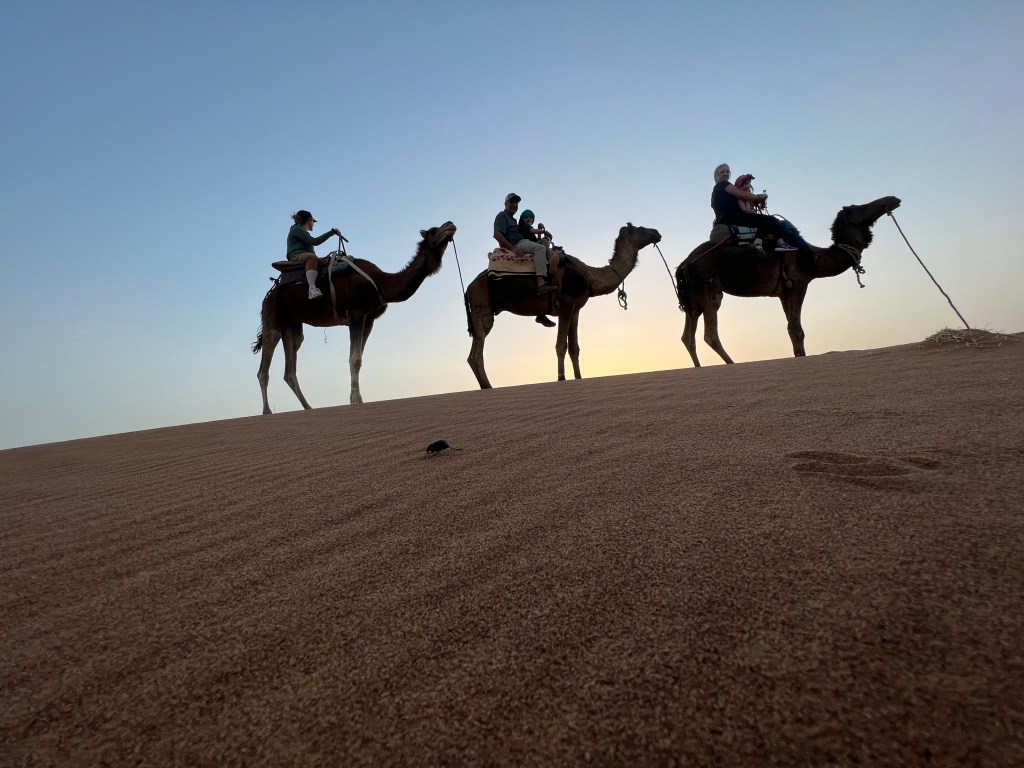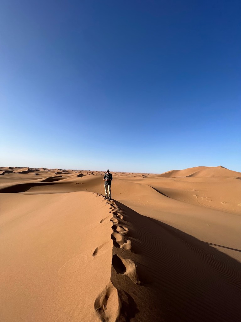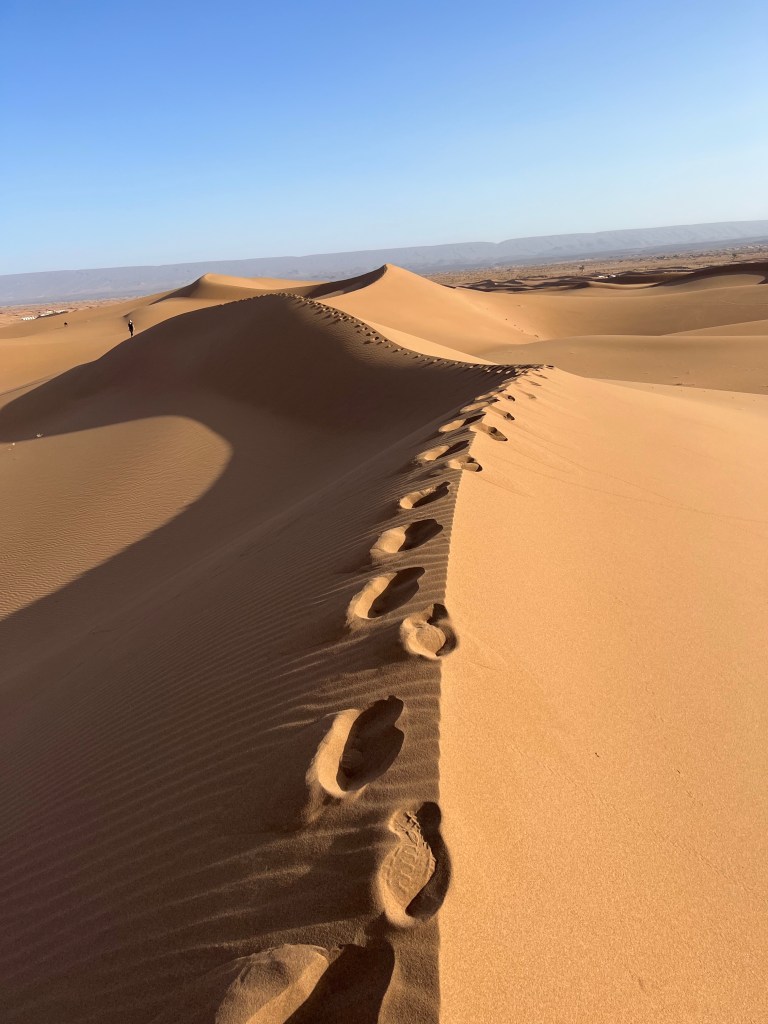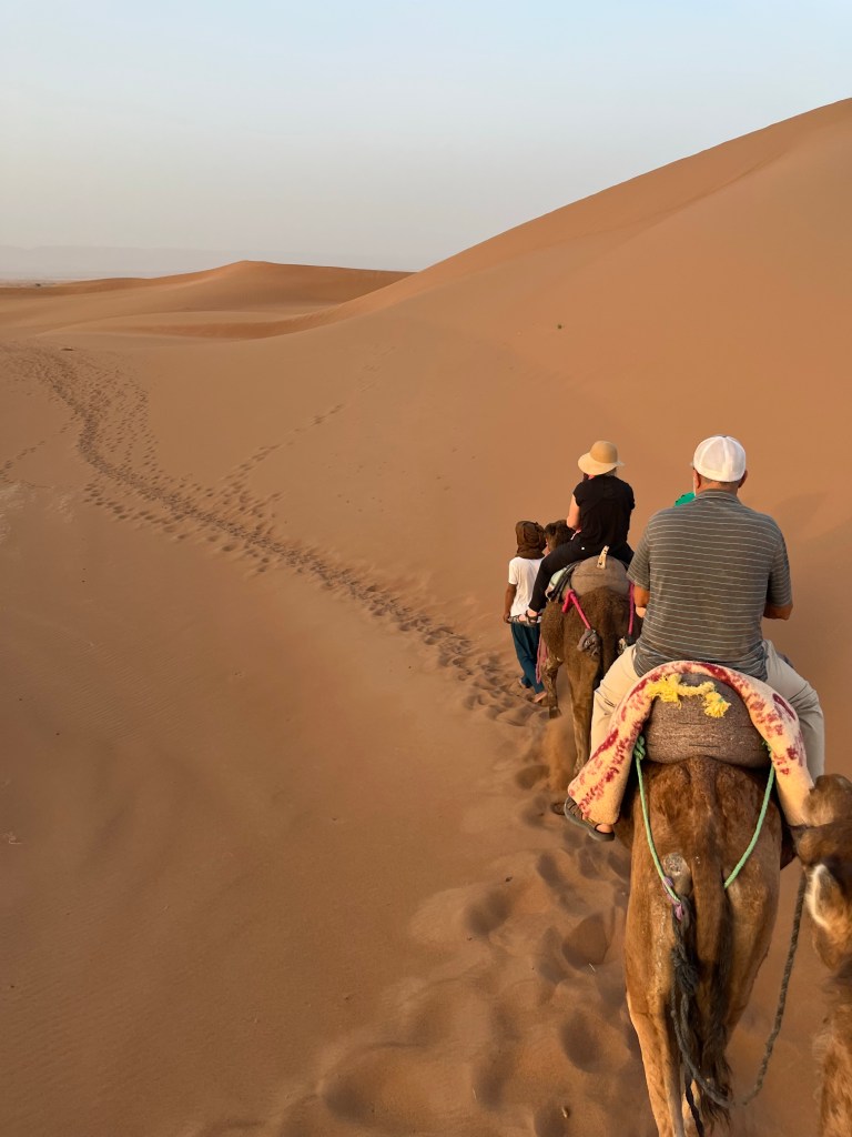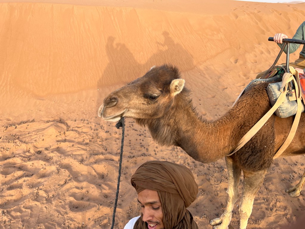 At the edge of the Sahara outside a town call Ouarzazate is the the Hollywood of Africa. A sweeping walled complex where films like The Gladiator and Game of Thrones filmed their desert scenes. It seems such an oddity and unwelcome reminder of that which you are here to escape. That being said it brings tourists to this corner of Morocco that may never have come and with it money so welcomed by the local economy. The Village Ait Ben Haddou is an oasis at the edge of the Sahara where water flows and palm trees flourish nestled beneath a thousand year old fortress. As we meander through the breezy, cool stone walkways of these ruins I admire the souvenirs crafted by local artisans including the desert scarves favored by the local Berbers. Pick one up before you trek into the desert, they are far more useful than any hat against unrelenting sun and sudden winds hurling sand in your face.