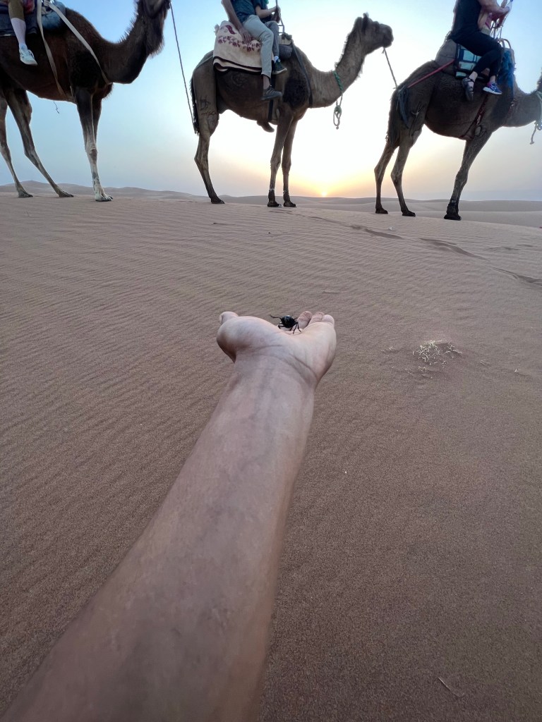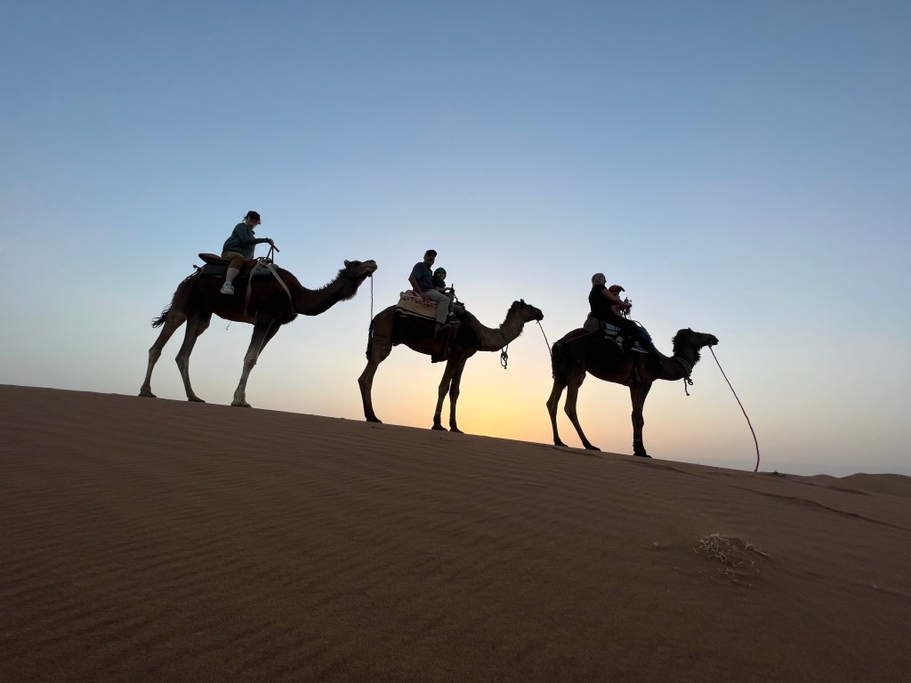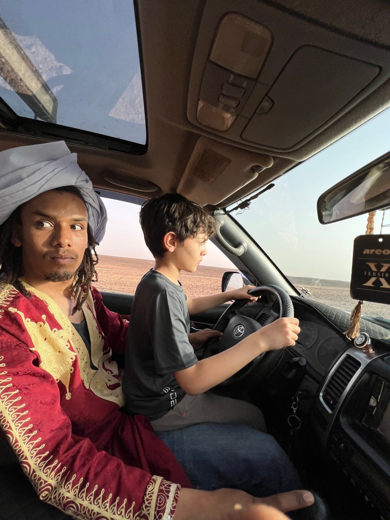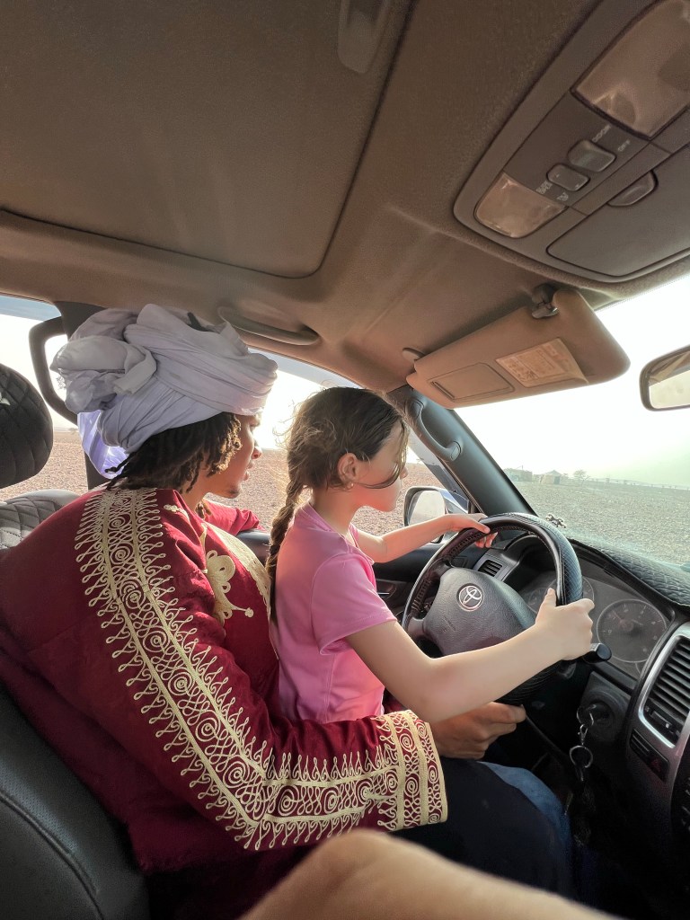 No transactions in the desert are rushed. Our soon to be guide serves us mint tea and dates and seats us comfortably and after the customary, lengthy pleasantries we discuss business. After much haggling, mostly in Arabic between he and my husband, we are lured to a more remote Berber camp with no tourists for an authentic experience. We had originally planned to leave from a closer town but what the hell, we are up for an adventure. We purposely kept our itinerary pretty loose so we could go with flow and change plans if we felt like it. And so just like that we set off into the desert. In a remote village called M’Hamid we ditch our car and hop into a jeep with Omar and skid across the sands into the true Sahara. Omar is always smiling and vibing. He plays his music loud; mostly local stuff with a true African beat and a hint of Reggae but he has Despacito on repeat and he sings every word in perfect Spanish.